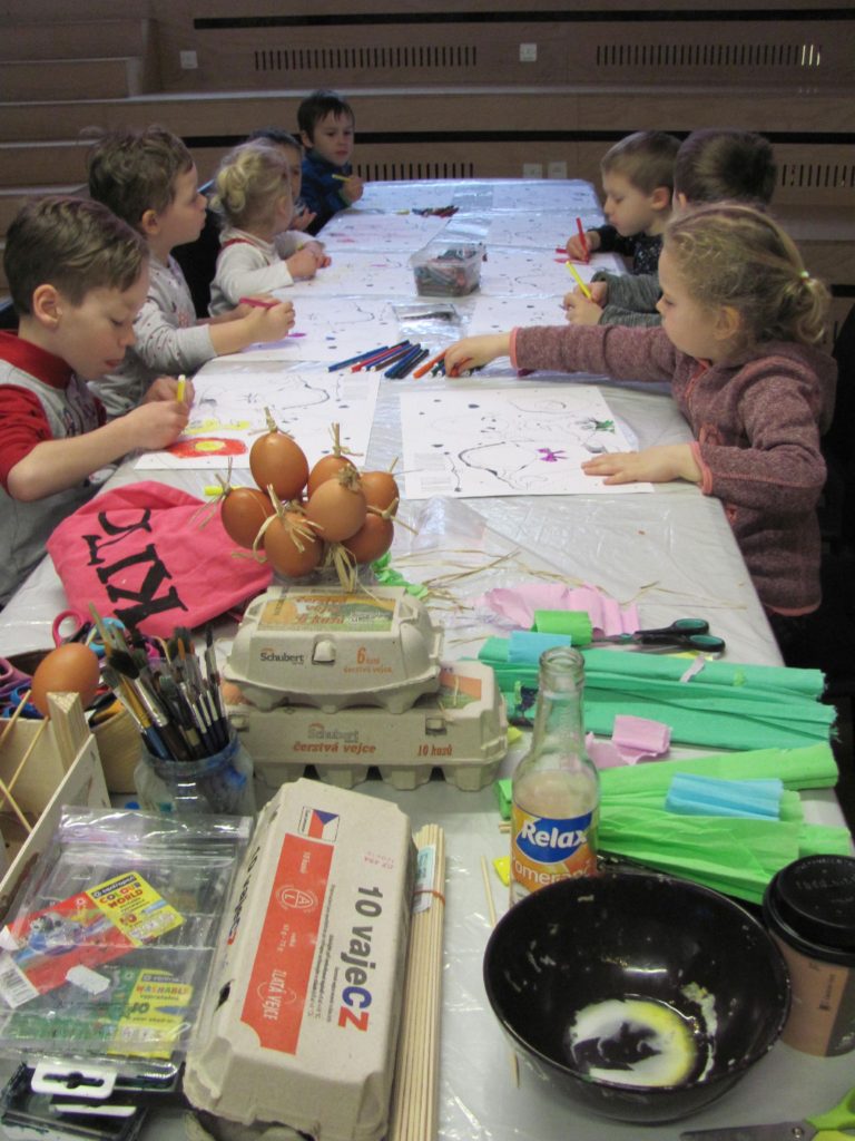 Velikonoce na nás čekali v kulturním centru Vozovna na Žižkově při tvořivé dílně s výtvarnicí Sofií. Nejprve jsme si povídali o velikonočních zvycích a tradicích a potom si vajíčka, jarní kytičky nebo mláďata, jedny ze symbolů svátků jara, vybarvili, vystřihli a nalepili na špejle. Kytička z krepáku by na nás byla asi moc těžká, tak tou nám zápich přizdobila sama Sofie.
